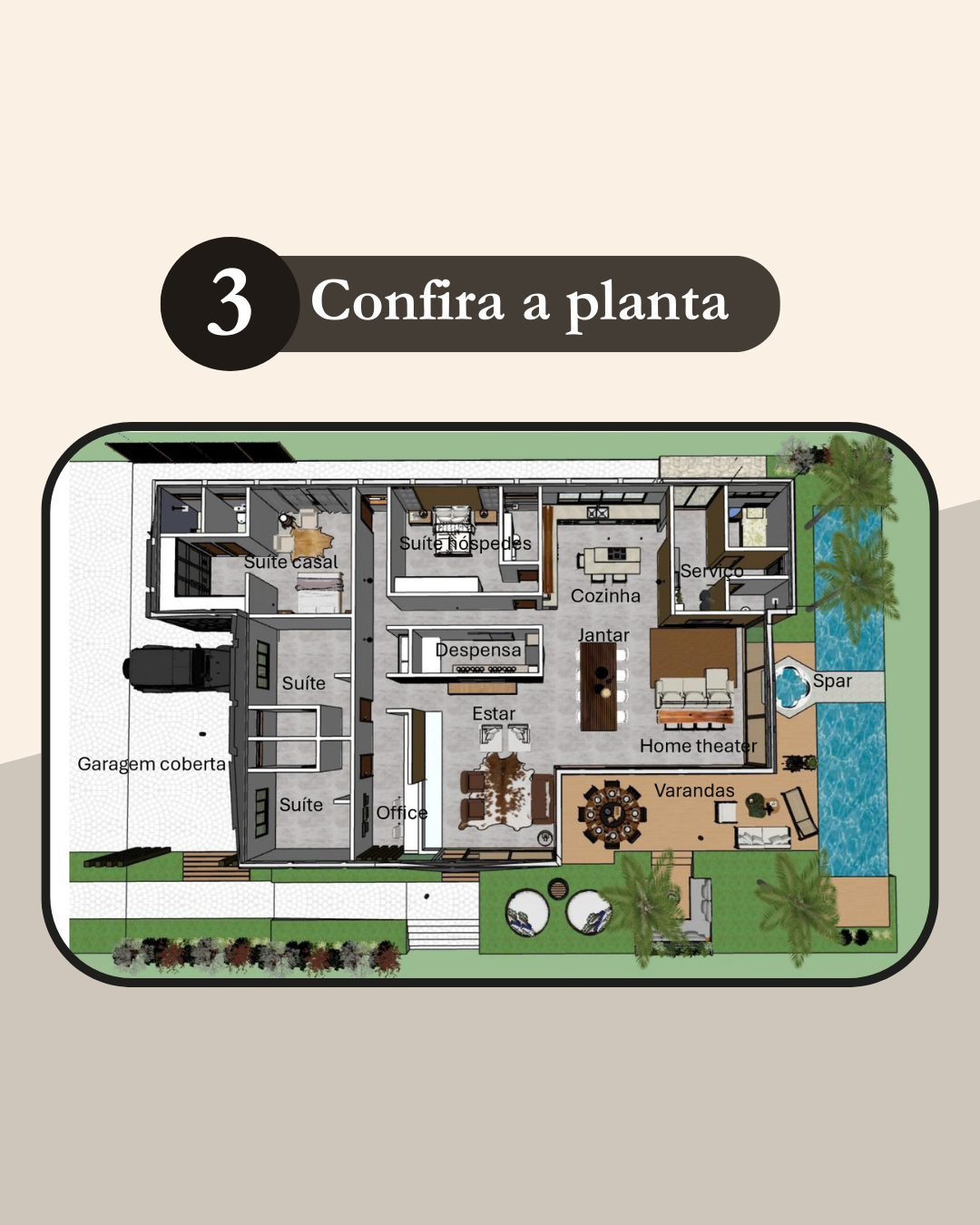 O Projeto de Iluminação define a localização das luminárias e interruptores, com suas especificações, facilitando a elaboração do Projeto Elétrico (sob encomenda). As luminárias serão posicionadas de acordo com o layout dos móveis sugerido no projeto.